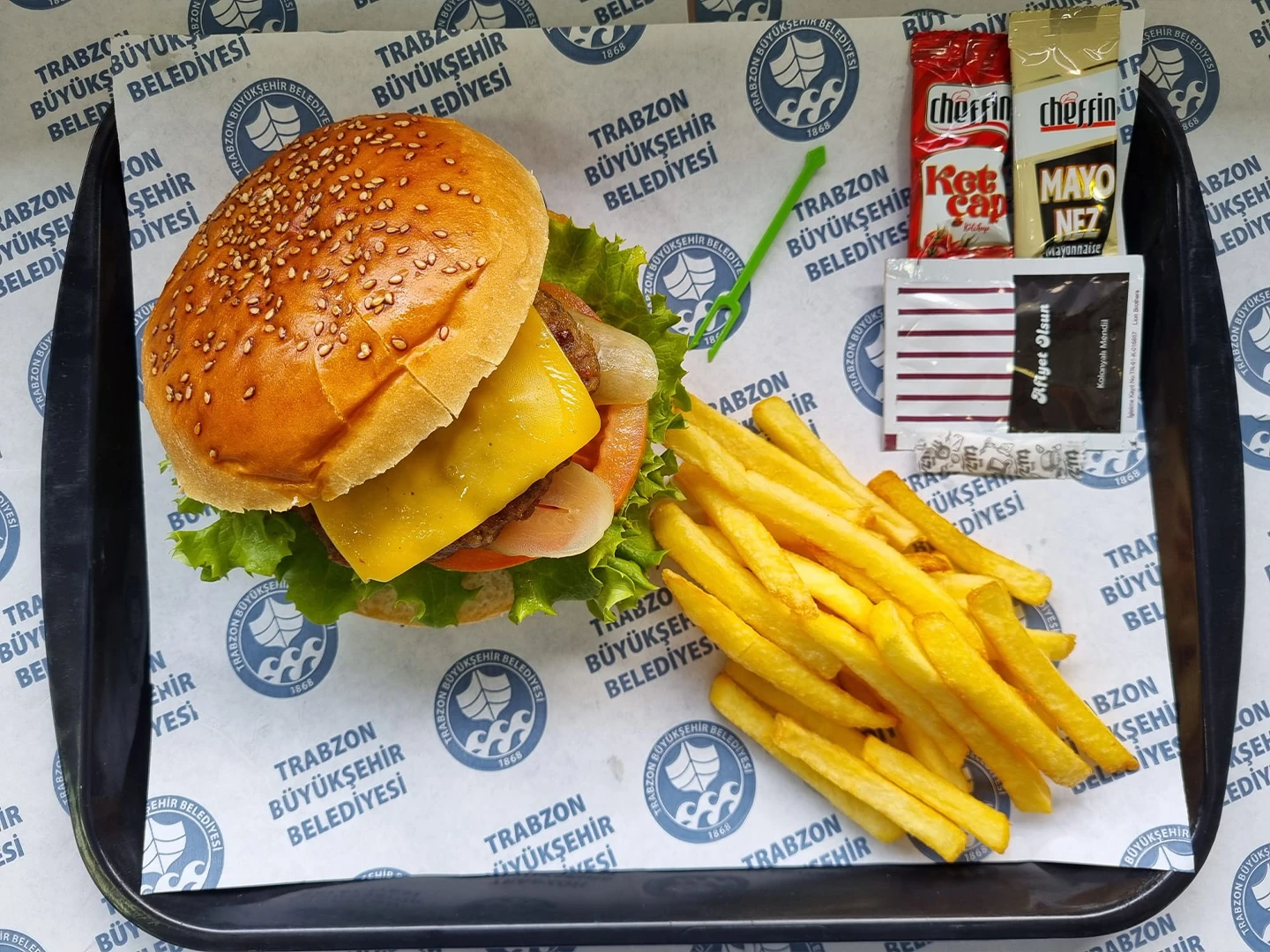 Hambuger ekmeği, hambuger köftesi, marul, domates, salatalık turşusu, dip sos yanında cips ketçap mayonez ile servis edilir.