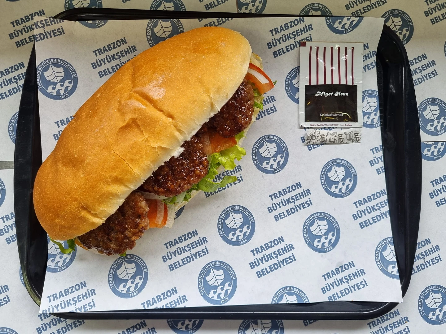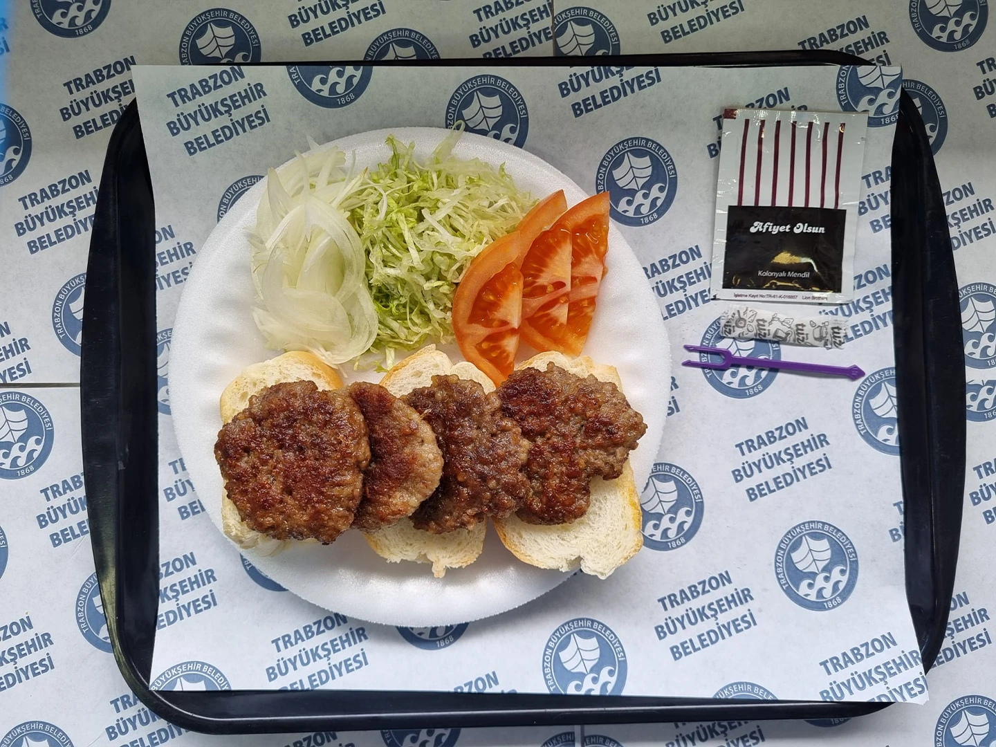Akçatabat köfte, kızarmış ekmek, domates ,marul, soğan.