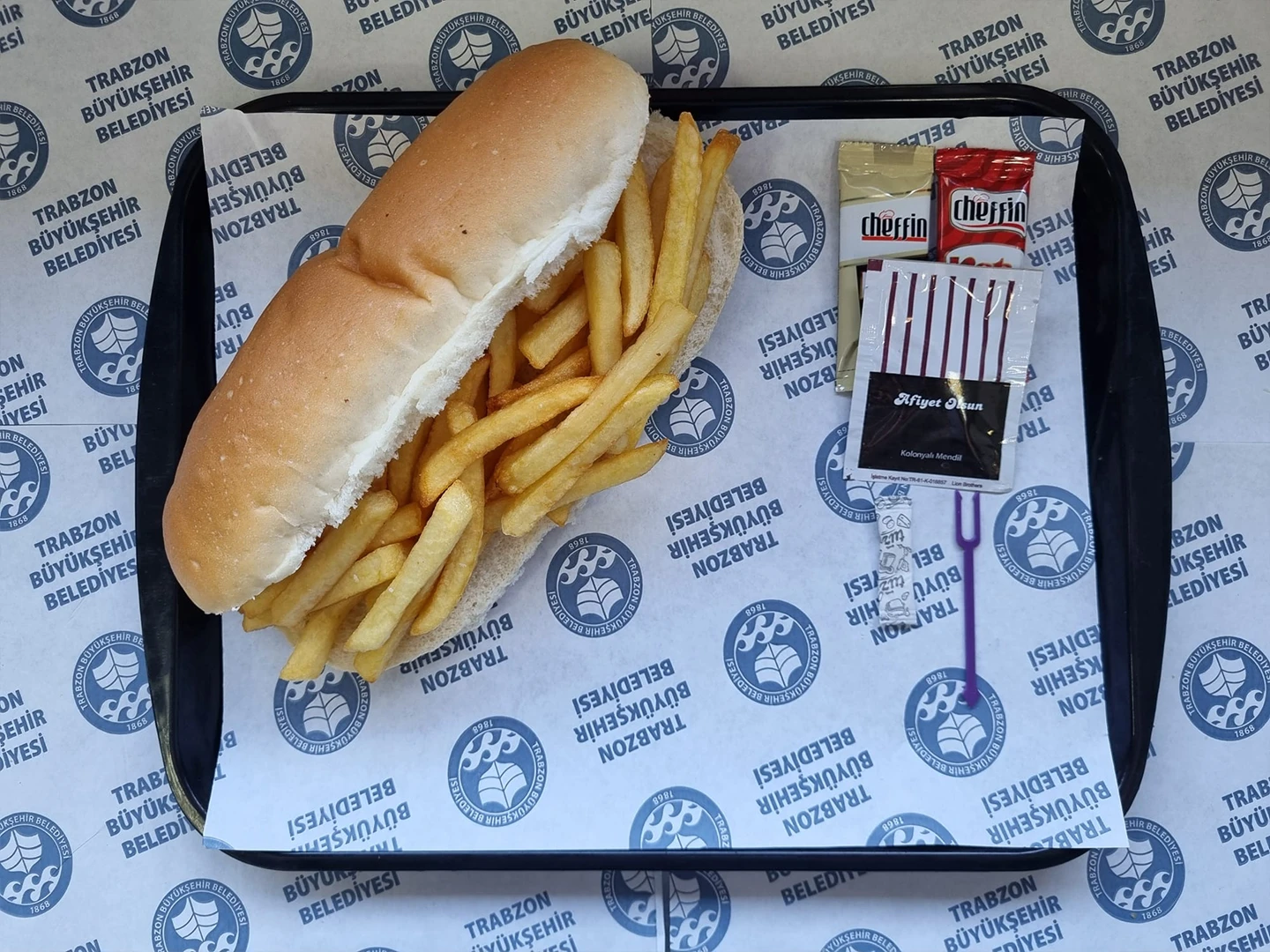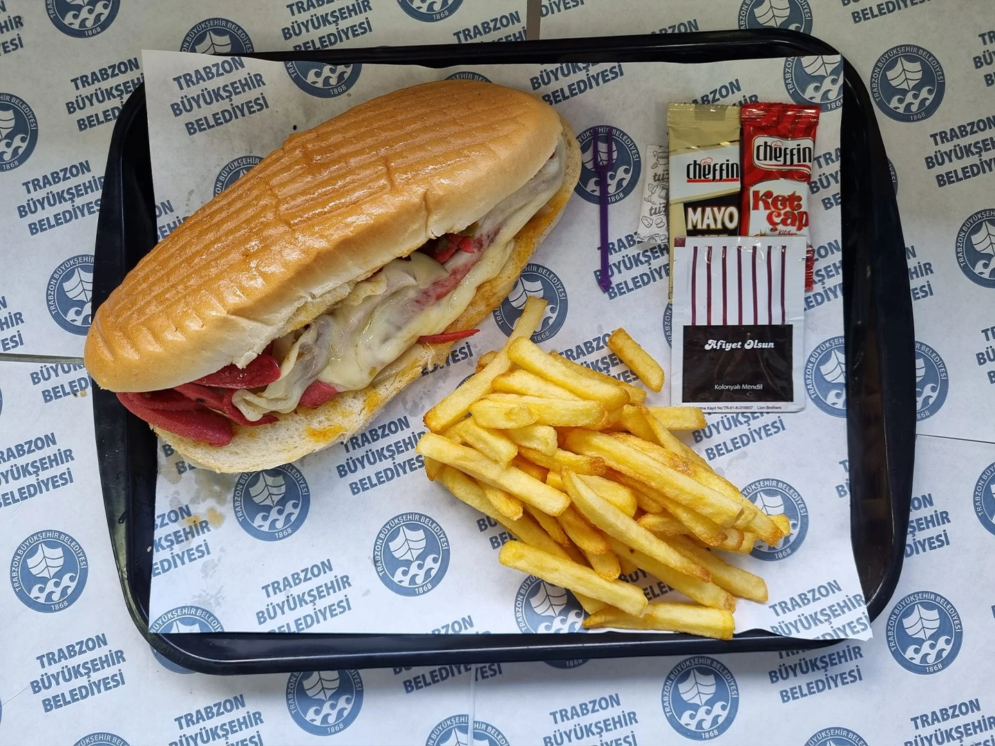 Ayvalık tost ekmeği, taze kaşar peyniri, sucuk yanında cips ketçap mayonez ile servis edilir.