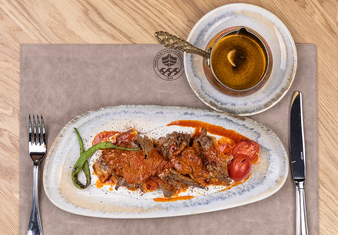 Yaprak döner, ızgara domates, ızgara biber, tereyağı ve domates sosuyla lezzetlenen döner, pide ve yoğurt eşliğinde servis edilir.