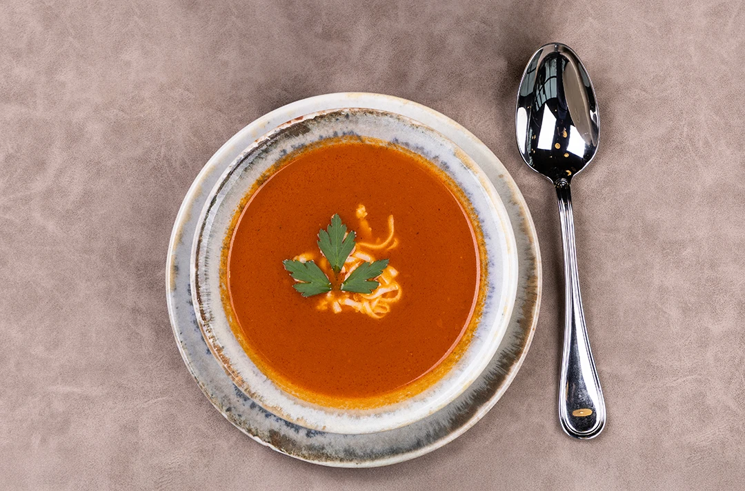 Közlenmiş domates, havuç, soğan, sarımsak, sebzeler ile hazırlanan hafif ve lezzetli çorba rende kaşar ve kroton ekmek ile servis edilir.