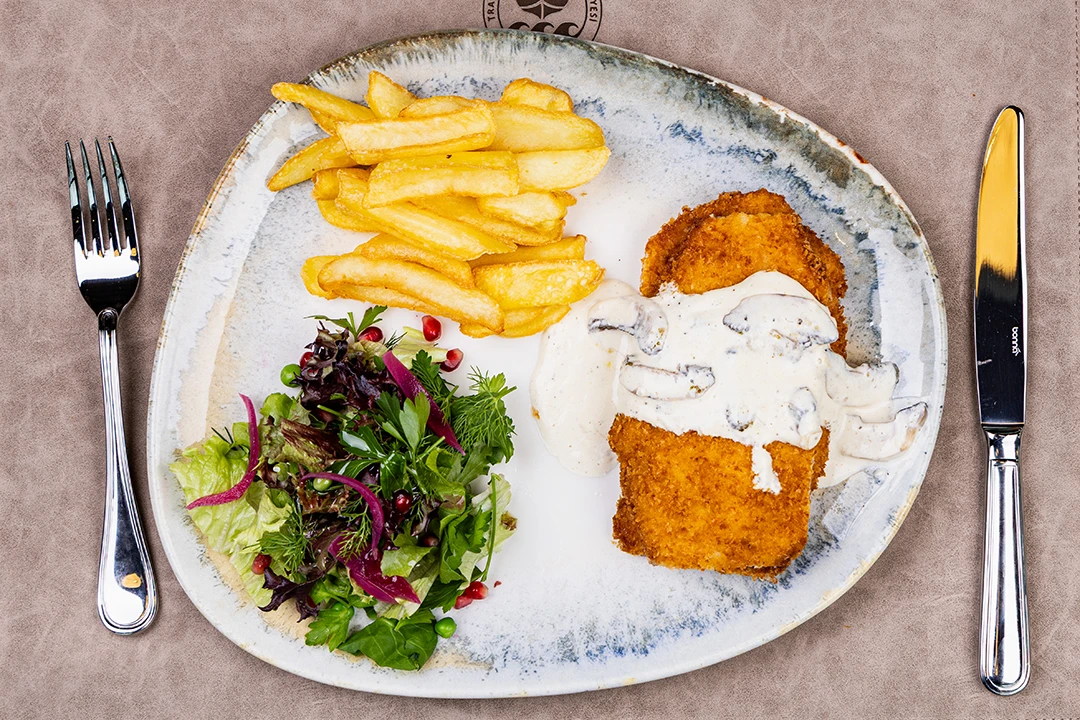 Tavuk göğüsü, mantar sos, cips ve yeşillik ile servis edilir.