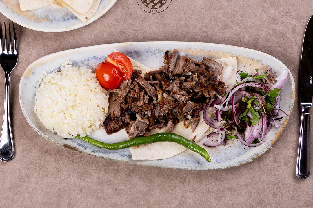 Et döneri, sumaklı soğan , ızgara biber domates,pirinç pilavi ve lavaş ile servis edilir