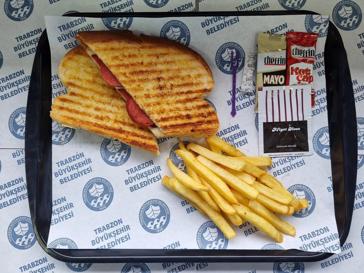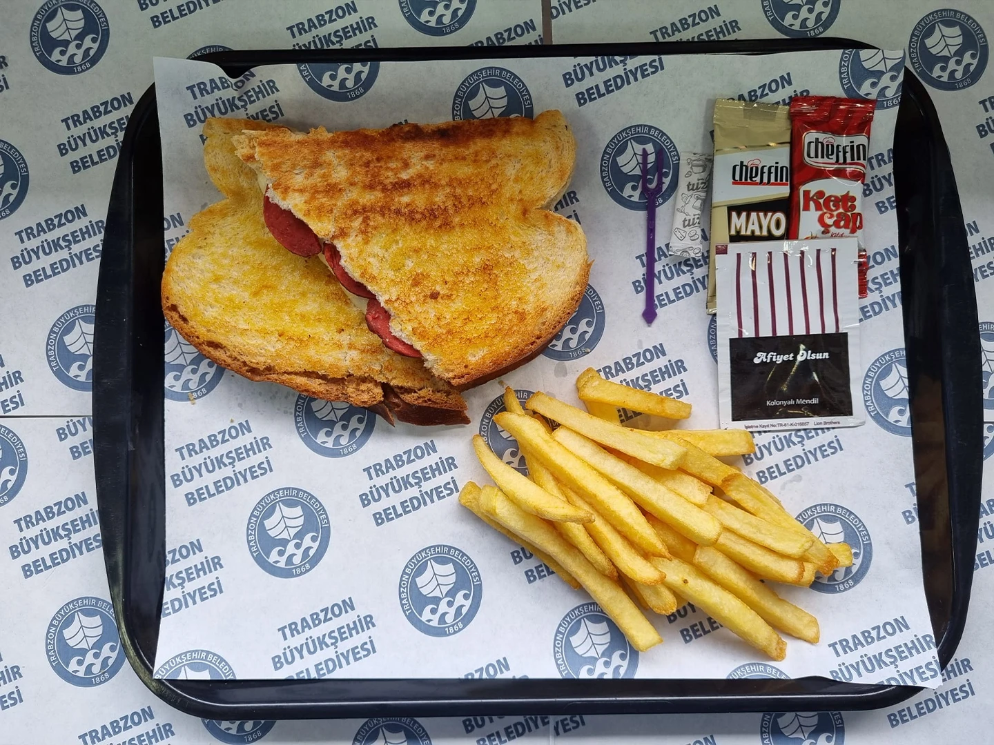 Sandviç ekmeği, sotelenmiş sosis, sucuk, çarliston biber, domates, taze kaşar peyniri yanında cips ketçap mayonez ile servis edilir.