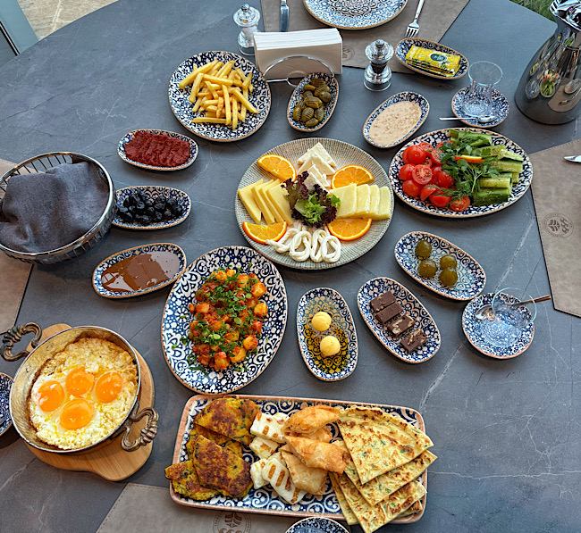Price per person 440 {Braided Cheese, Barrel Cheese, local (Ezine)Cheese, local (Kars)Kashar Cheese, Butter, Honey, Hazelnut Spread, local Tokat Molasses, Fig Jam, Concrete Winter Halva, Cherry Tomatoes, Cucumber, Black Olives, Grilled Green Olives, Acuka (Spicy Pepper Paste), Grilled Halloumi Cheese, Fried Potatoes, Zucchini Fritters, Fried Eggs, Kaygana (Turkish Omelette), Crispy Pastry, Chips and Unlimited Tea} (The breakfast in the image is for 4 people)