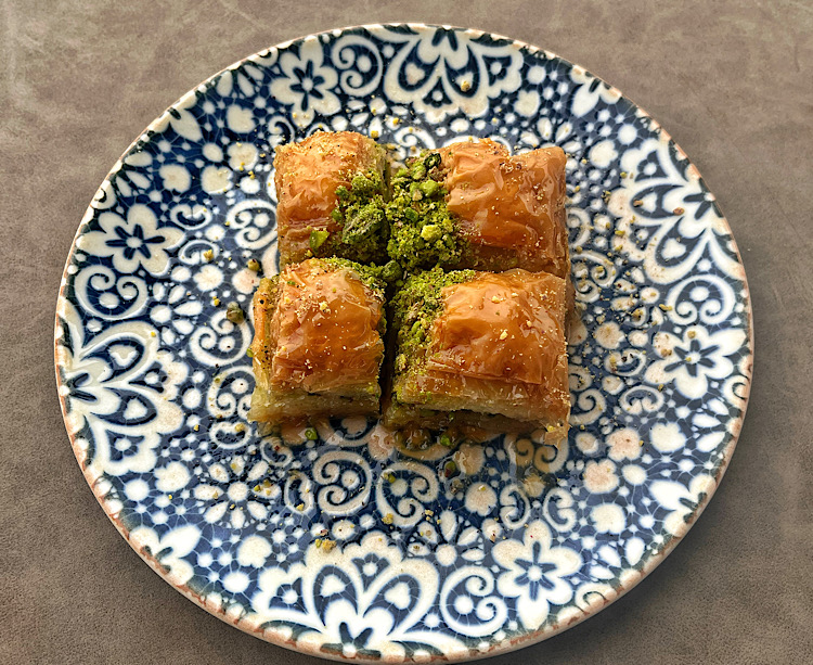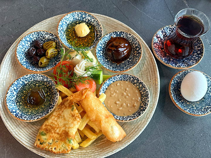 Black olives, grilled green olives, honey, butter, fig jam, hazelnut spread, Local molasses, kaygana (a type of Turkish omelet), crispy pastry, greens, local (Kars) kashar cheese, local (Ezine) cheese, braided cheese, boiled egg, tomato, cucumber + 3 teas