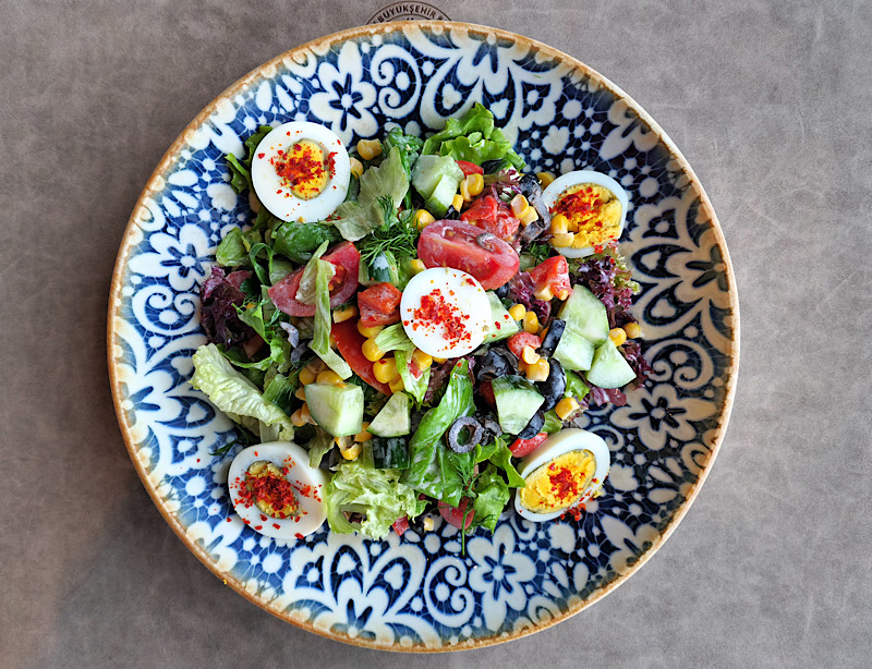 It is prepared with lettuce, arugula, tomatoes, cucumber, black olives, corn, dill, lolorosso, hard-boiled eggs and special special sauce.