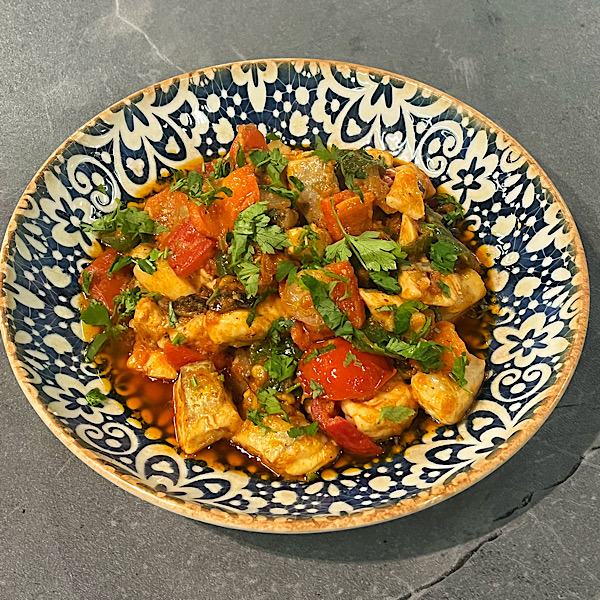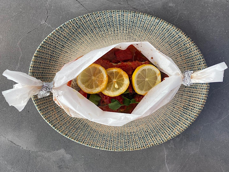 Sea Bass Fillet, grated tomatoes, green pepper, red pepper, butter, bay leaf, black peppercorns, olive oil, parsley.