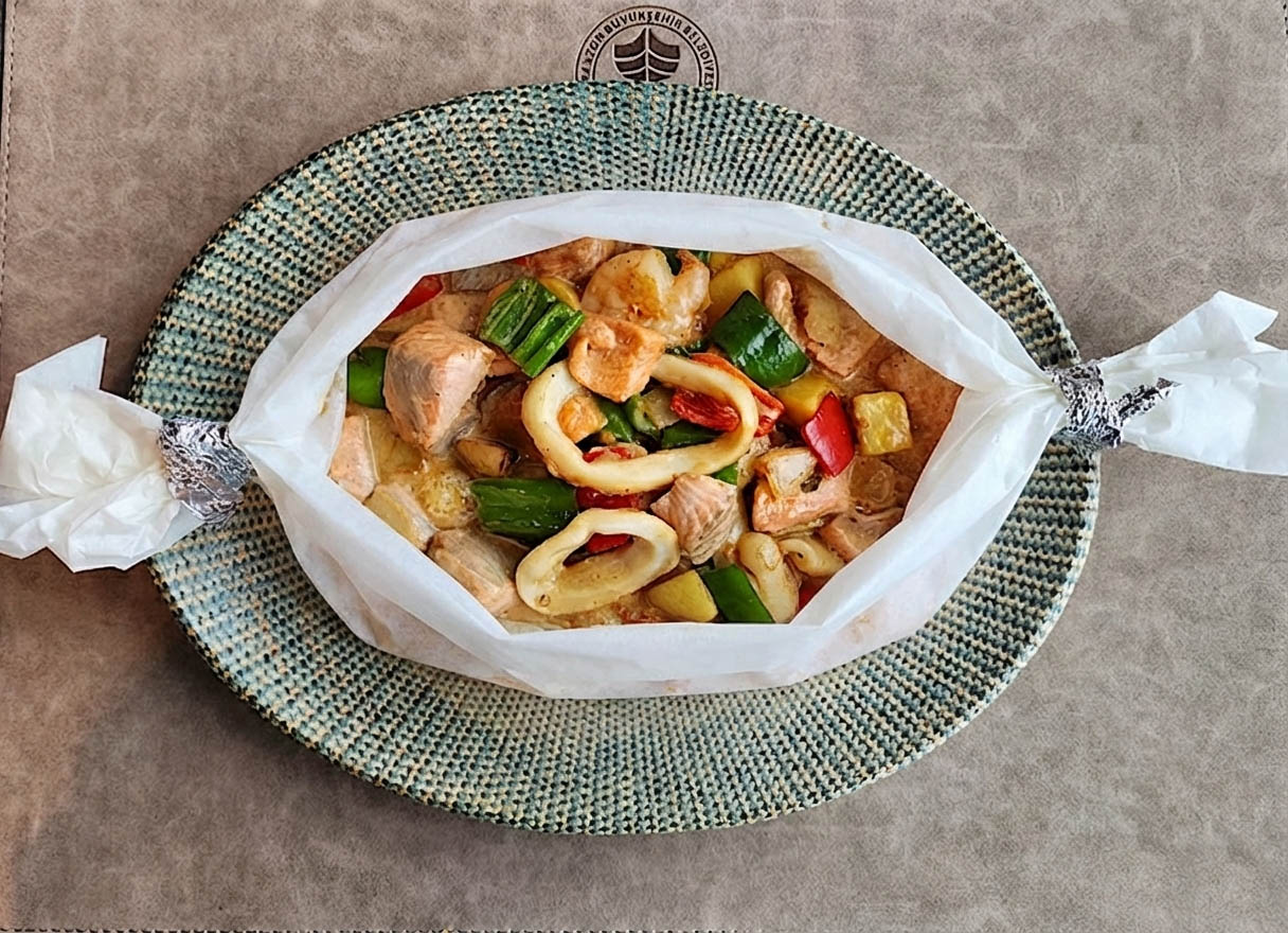 Sea Bass Fillet is prepared with onion, mushrooms, parsley, garlic, capia pepper, bell pepper, bay leaf.