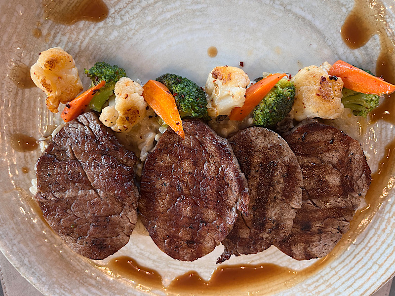Eggplant and mushroom risotto served with steak, boiled carrots, broccoli, cauliflower and demi-glace sauce.