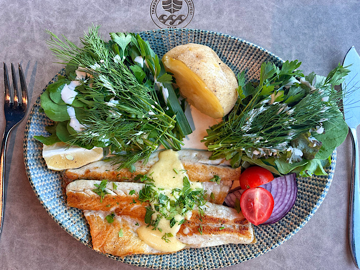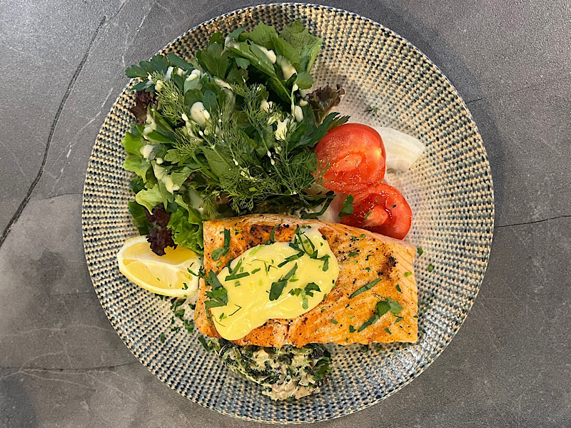 Ask the waiter for the price. Served with lemon, arugula, radish, cherry tomatoes, parsley, dill, green onion and hollandaise sauce.