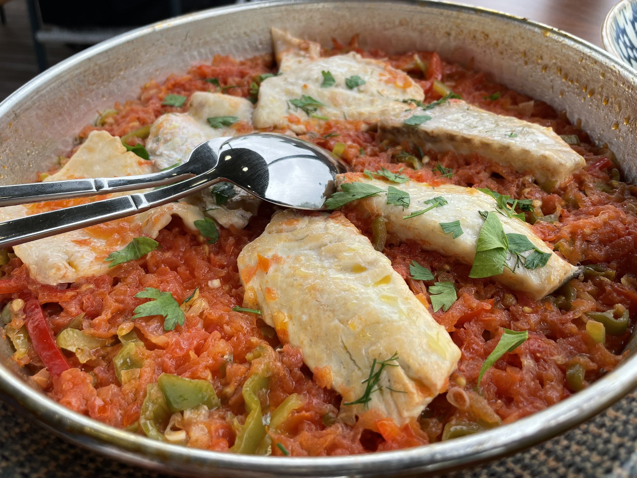 Our Legendary Flavor Steamed Sea Bass Fillet, grated tomato, bell pepper, capia pepper, butter, bay leaf, black pepper, extra virgin olive oil, parsley sprigs.