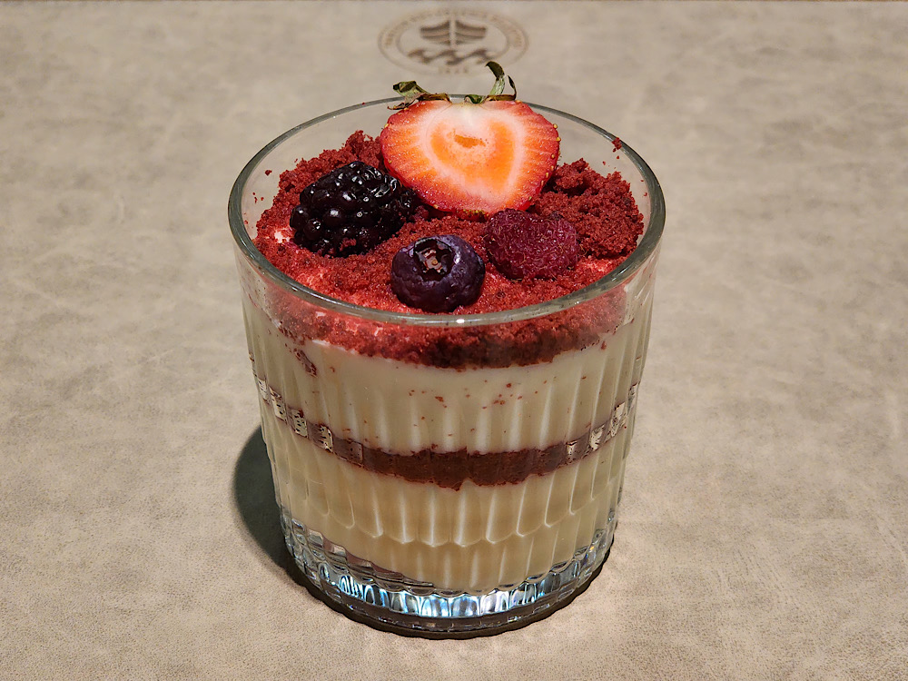 Forest fruit cup with blueberries, raspberries, blackberries, cake and light cream.