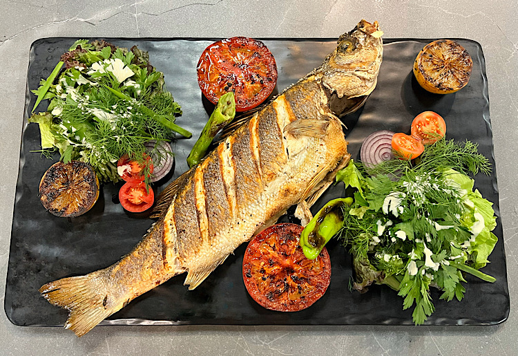 Akdeniz yeşillikleri, Levrek Izgara, roka, maydanoz, çeri domates, taze soğan, kırmızı soğan, yağ ve limon sosu içerir.