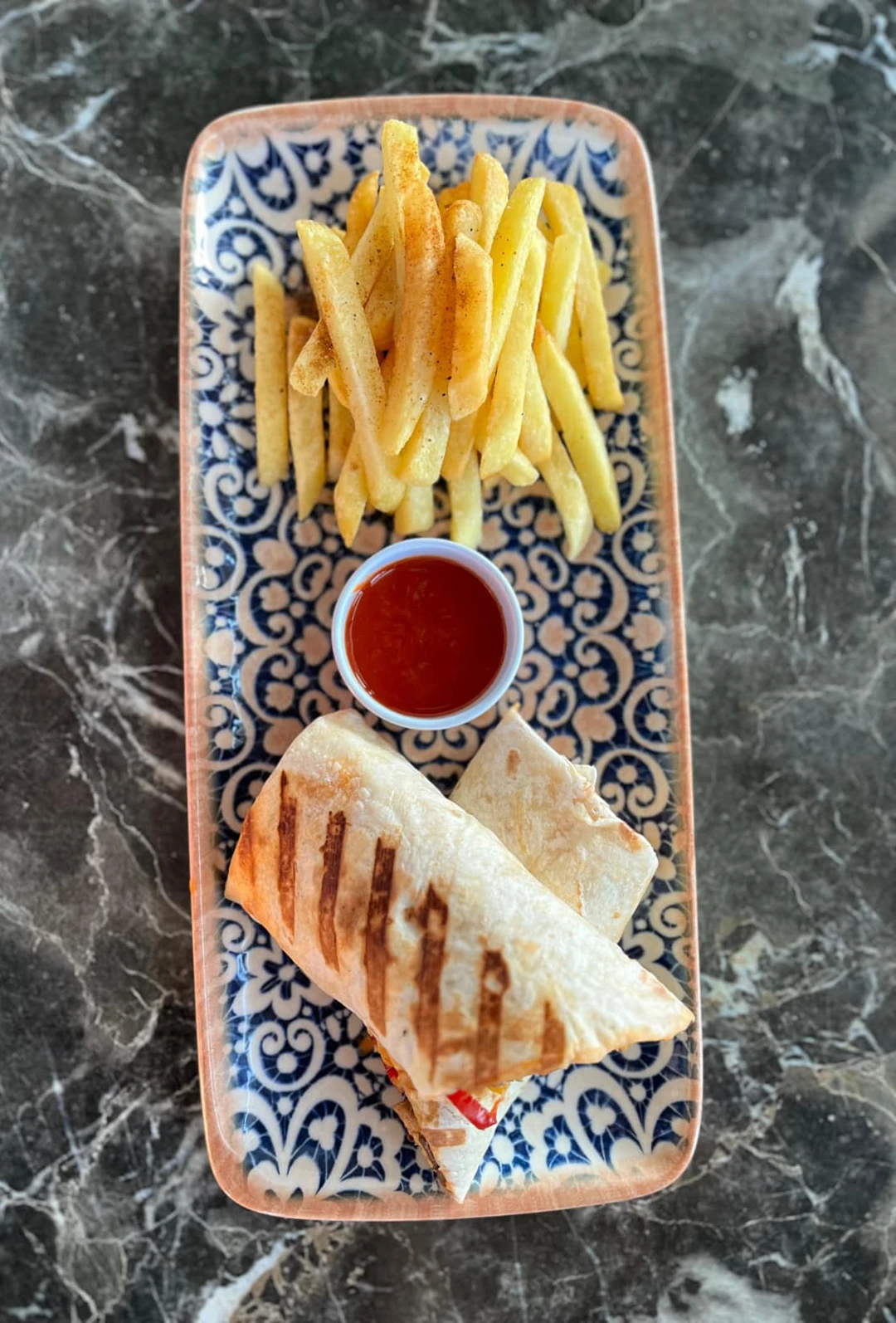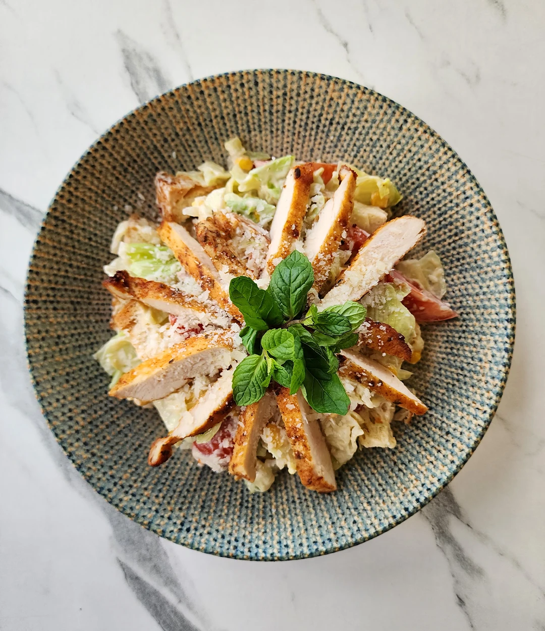 Marul , lolorosso , cherry domates , kroton ekmek , ızgara tavuk , sezar sos
