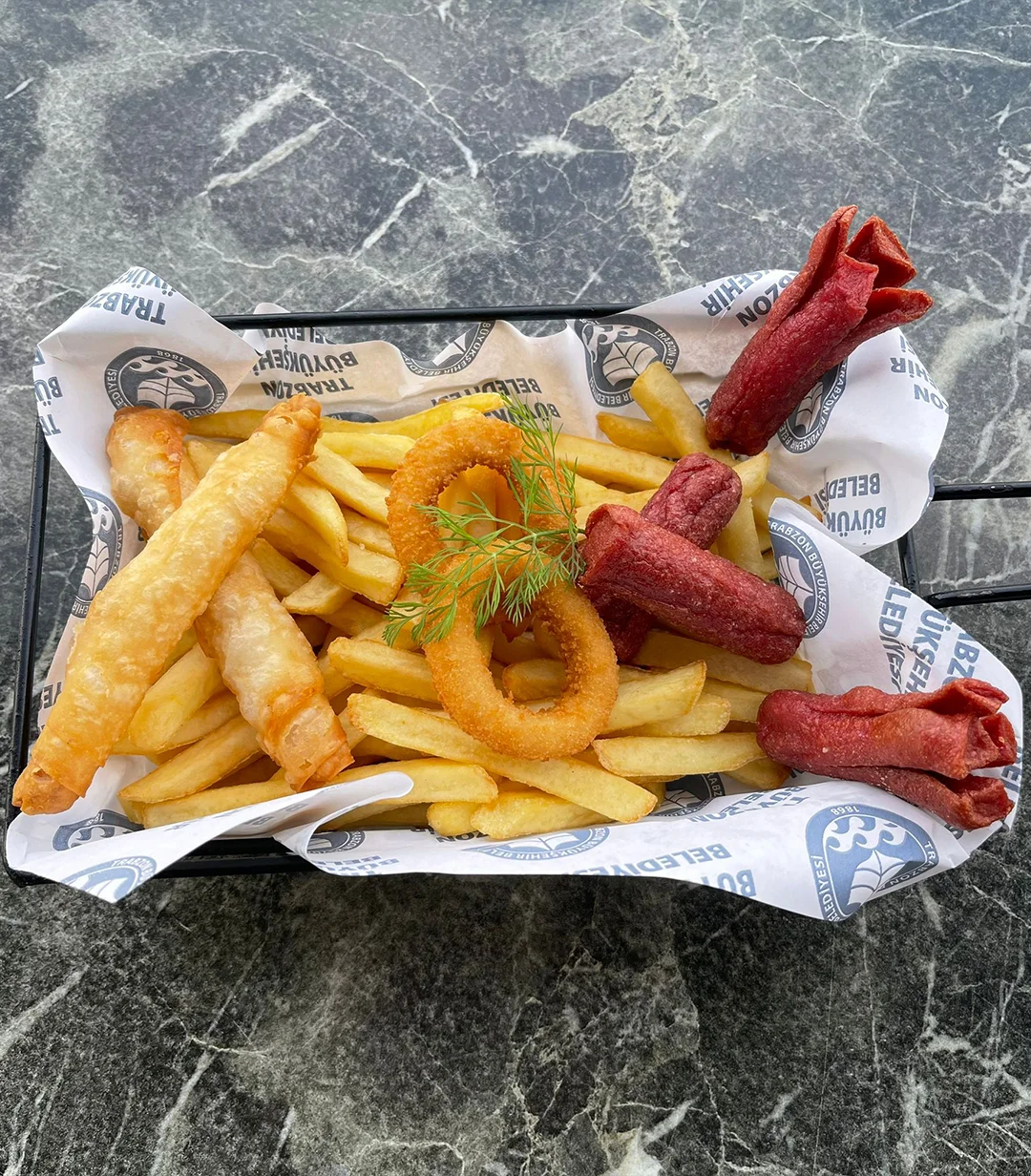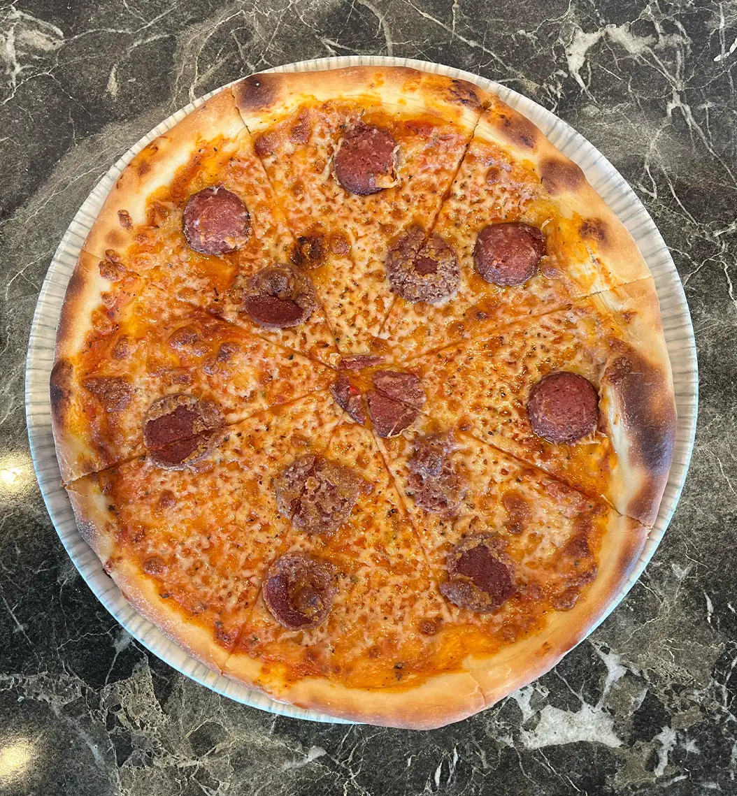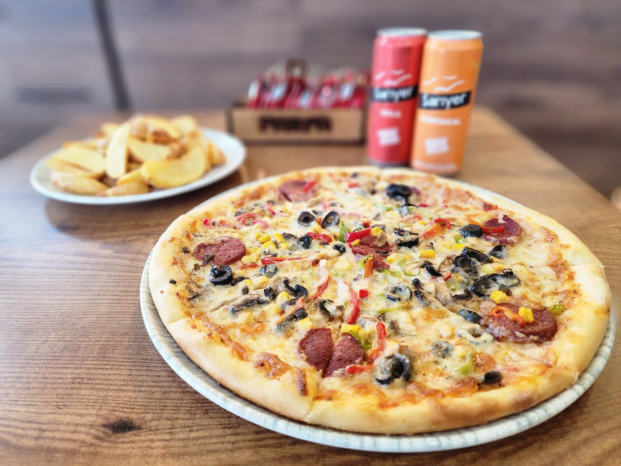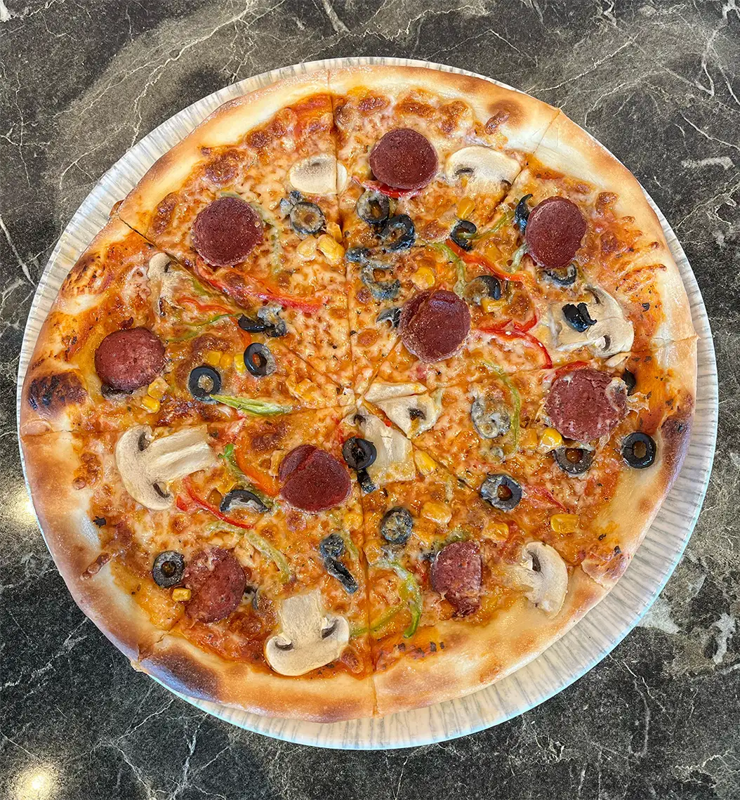 Dana sucuk, mozarella, kapya biber, mantar, zeytin, mısır, domates sos